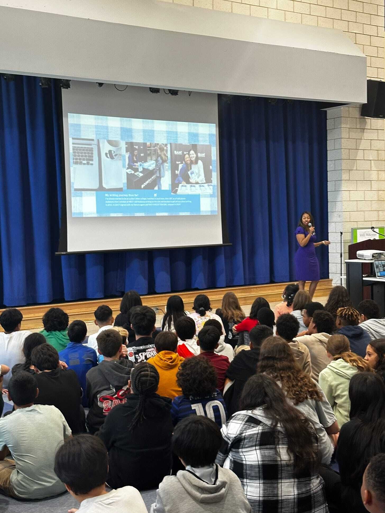 I first shared my presentation to the 4th and 5th graders. I talked about my writing journey, my books, and the inspiration behind them, followed by a Q&A with the students. After a short break, I talked with the 6th and 7th graders, with a slightly modified presentation tailored to the older age group.